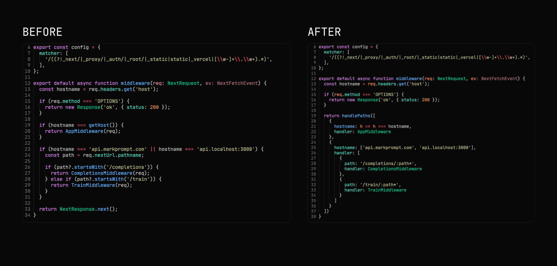 Traditionally, managing middleware in Next.js can be challenging, especially when dealing with complex routing scenarios. For example, you may want to apply an authentication middleware only for certain paths or a subdomain-specific middleware for certain hostnames